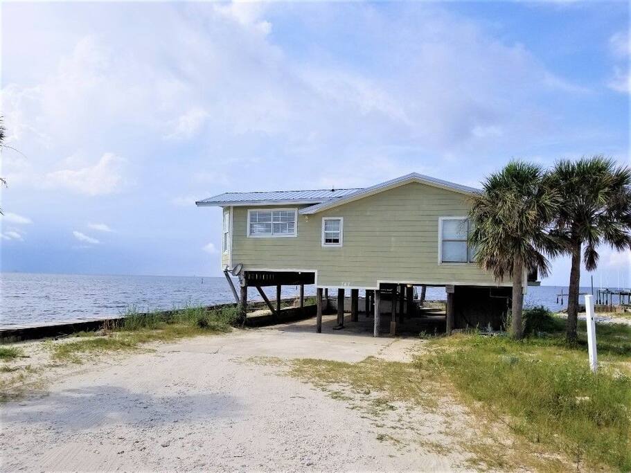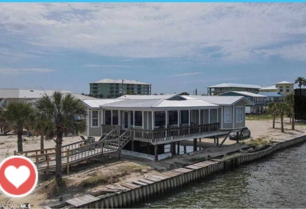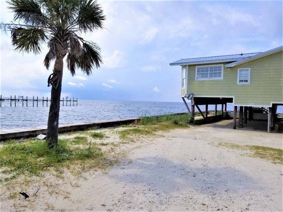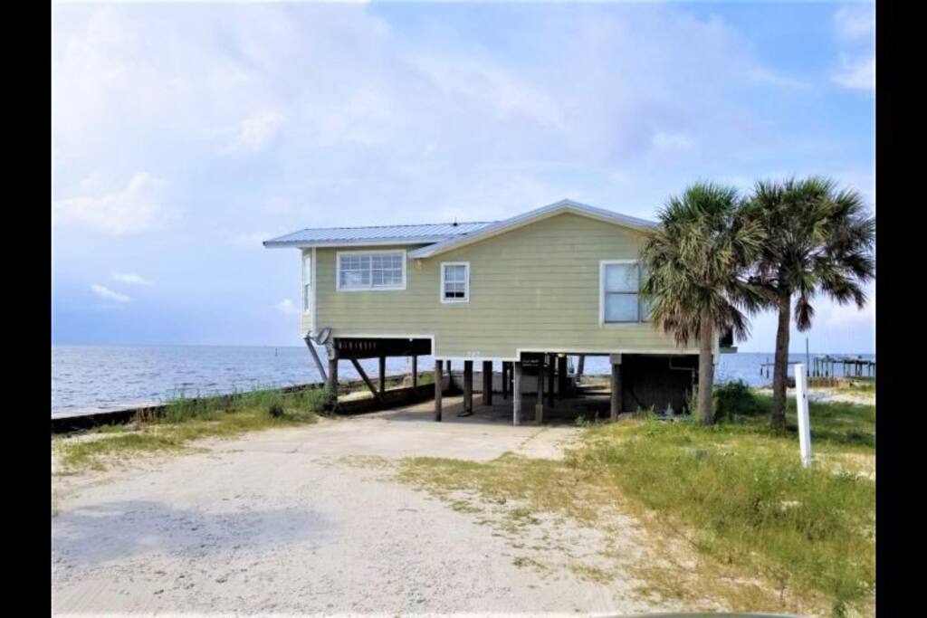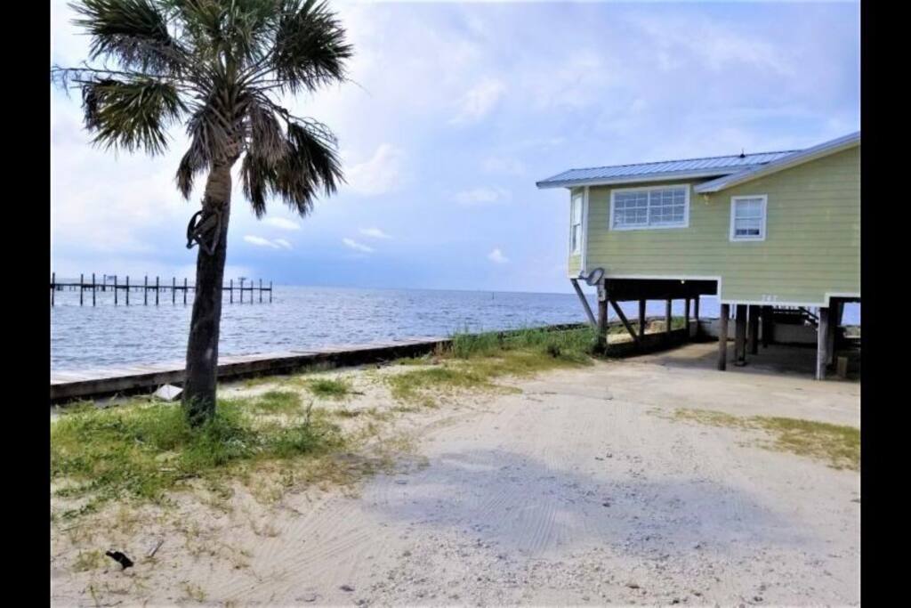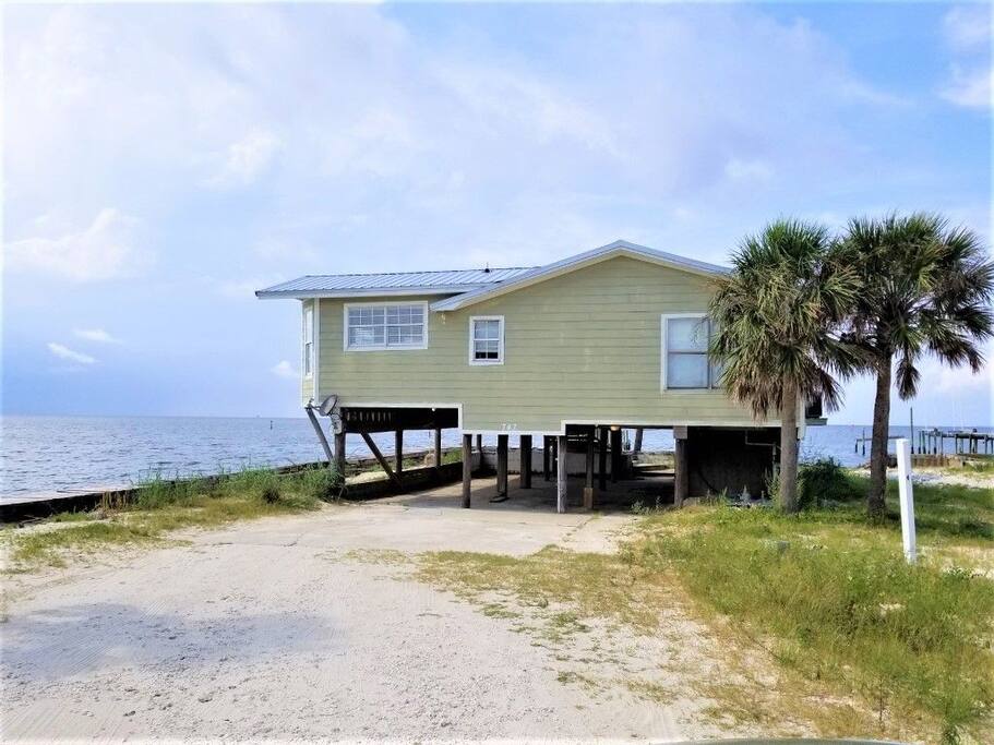 Please note - This unique home has been discounted because part of this seawall still has some hurricane damage but now has about 50 feet of boardwalk along the top of the seawall .Until the seawall is repaired there may be water directly under the house after a storm so currently there's no parking under the house but the rest of this half acre lot will remain dry so there is still plenty of flat parking spaces to accommodate several vehicles. workers may or may not be there during your stay but just working on the wall and not on the house during June & the first part of July. This lake Cottage is unique in many ways! - You could fish right from the porch but also has a boardwalk about 50 ft ) along the top of the seawall. - Beach access across the street! (about 1/4 mile) walk or park right beside the sand! - famous golf courses start about one mile away! - Grocery/Dollar General, gas stations, ferry boat (to Mobile), Tacky Jack's on the water, boat rentals, fishing charters, and a full Spa all very close by! - Fastest WiFi in the area! - Part of the awesome Ft. Morgan community in Gulf Shores that even has pot luck dinners sometimes on the weekends within a couple miles and on the Bay! - It is the last home in the back of the subdivision on a corner lot! - It has one of the best views of Mobile Bay and sunsets and you can also see the sunrise! - It has 150+ feet of private water access to fish, dock your boat, etc.! - Launch your kayak or boat etc. right from this home! - Enjoy the wrap around porch for many different wide views of dolphins swimming, etc. etc.! - Large windows throughout Living room for the best views inside also! - Breakfast nook with a Bay window to enjoy close up views while drinking your coffee or eating dinner with your family and friends! - Lots of windows in the Master bedroom also makes you feel like your outside! - Private bath in Master bedroom plus comfortable mattresses! - Natural wood ceilings for a more cozy cabin feeling! - So you've got golf, beach, open gulf, shopping, restaurants, bars, ice, deli, and the ferry, etc. all close by for your convenience!