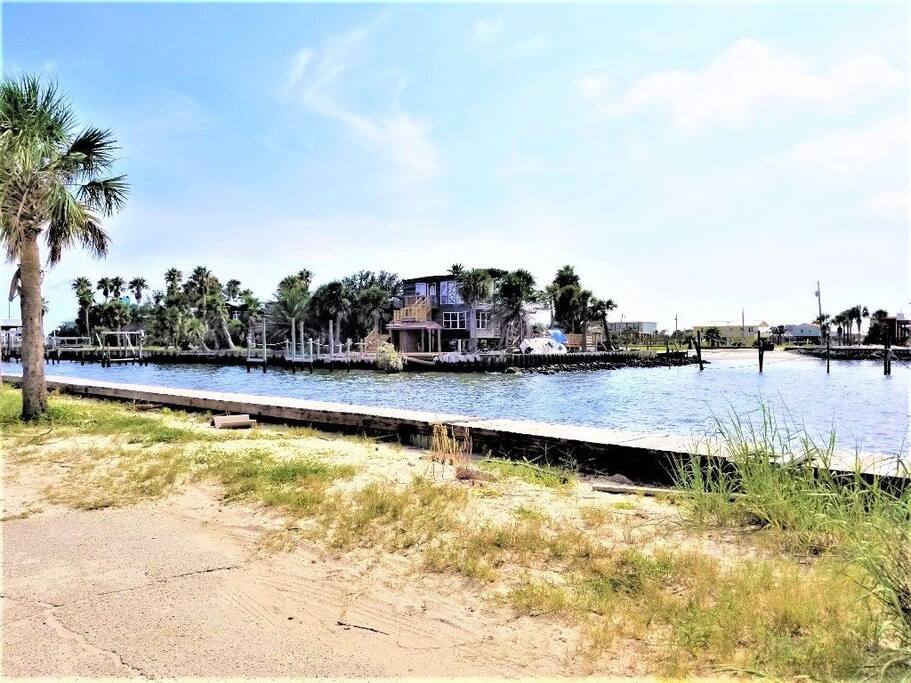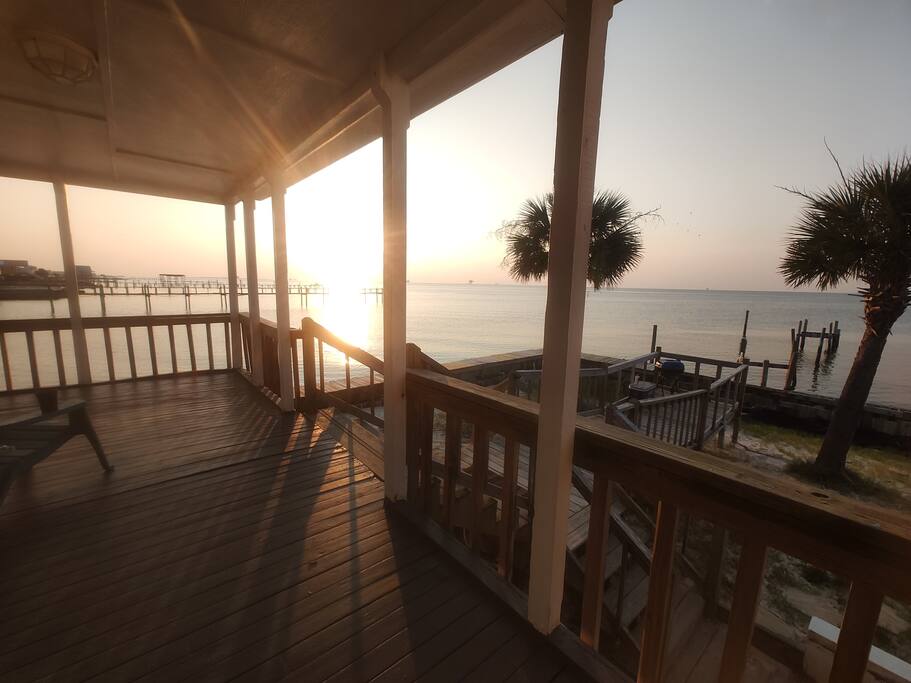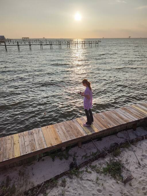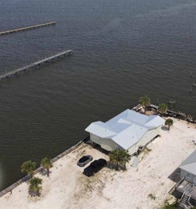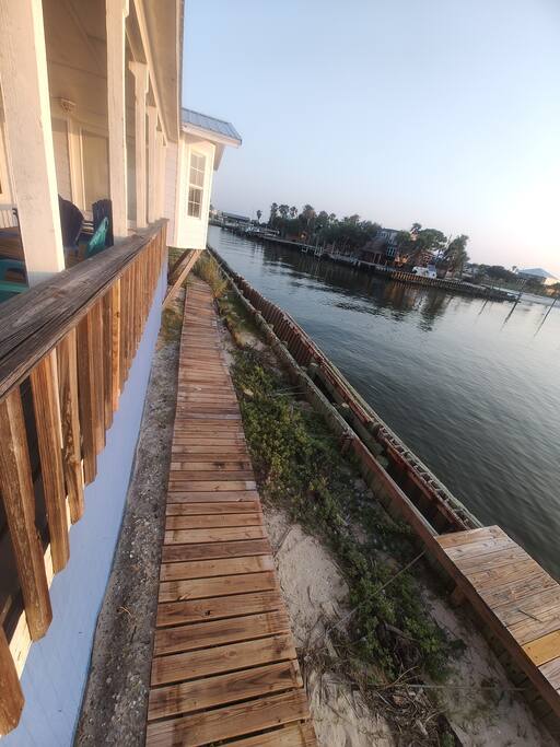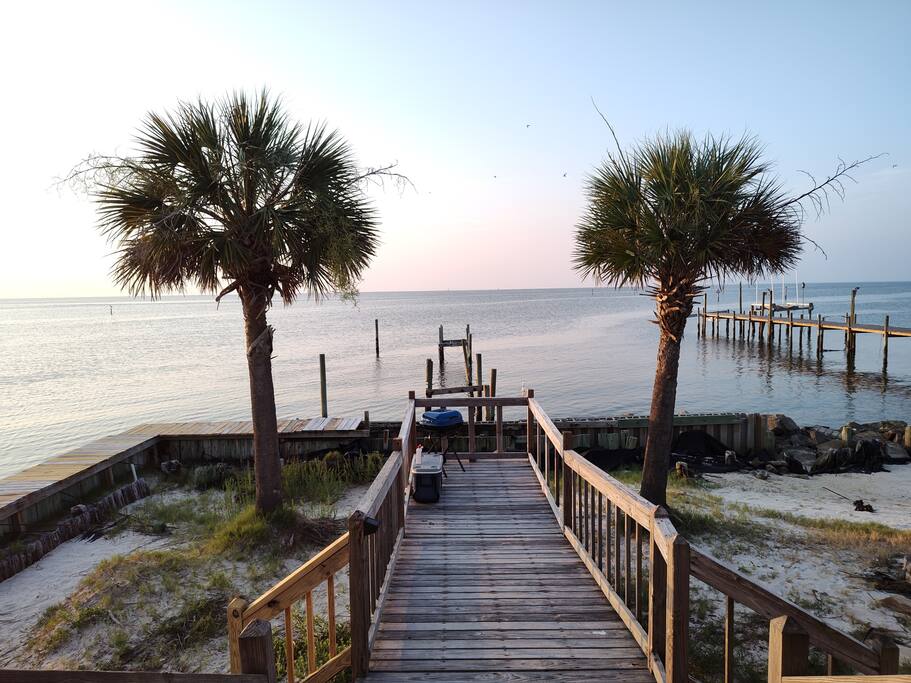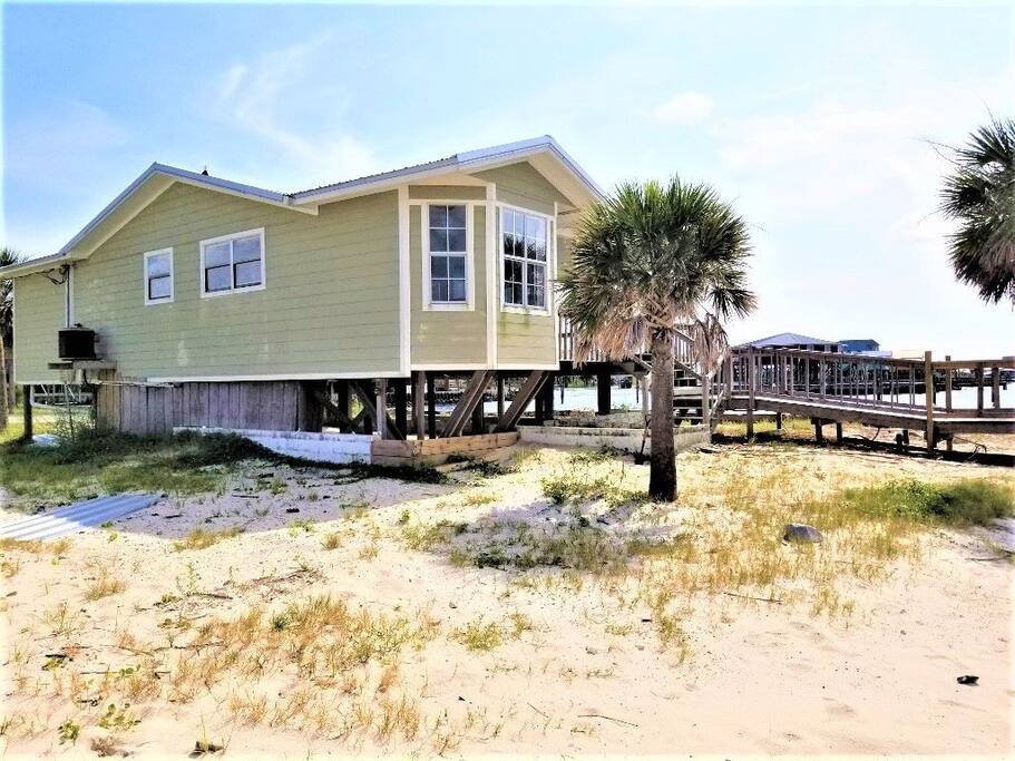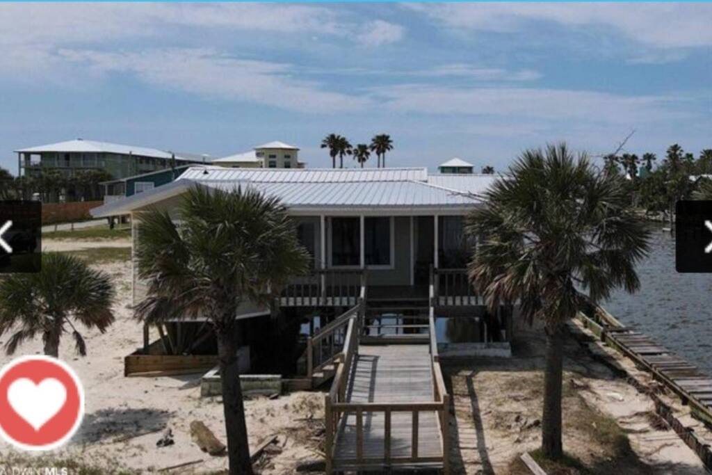 Please note - This unique home has been discounted because part of this seawall still has some hurricane damage but now has about 50 feet of boardwalk along the top of the seawall .Until the seawall is repaired there may be water directly under the house after a storm so currently there's no parking under the house but the rest of this half acre lot will remain dry so there is still plenty of flat parking spaces to accommodate several vehicles. workers may or may not be there during your stay but just working on the wall and not on the house during June & the first part of July. This lake Cottage is unique in many ways! - You could fish right from the porch but also has a boardwalk about 50 ft ) along the top of the seawall. - Beach access across the street! (about 1/4 mile) walk or park right beside the sand! - famous golf courses start about one mile away! - Grocery/Dollar General, gas stations, ferry boat (to Mobile), Tacky Jack's on the water, boat rentals, fishing charters, and a full Spa all very close by! - Fastest WiFi in the area! - Part of the awesome Ft. Morgan community in Gulf Shores that even has pot luck dinners sometimes on the weekends within a couple miles and on the Bay! - It is the last home in the back of the subdivision on a corner lot! - It has one of the best views of Mobile Bay and sunsets and you can also see the sunrise! - It has 150+ feet of private water access to fish, dock your boat, etc.! - Launch your kayak or boat etc. right from this home! - Enjoy the wrap around porch for many different wide views of dolphins swimming, etc. etc.! - Large windows throughout Living room for the best views inside also! - Breakfast nook with a Bay window to enjoy close up views while drinking your coffee or eating dinner with your family and friends! - Lots of windows in the Master bedroom also makes you feel like your outside! - Private bath in Master bedroom plus comfortable mattresses! - Natural wood ceilings for a more cozy cabin feeling! - So you've got golf, beach, open gulf, shopping, restaurants, bars, ice, deli, and the ferry, etc. all close by for your convenience!