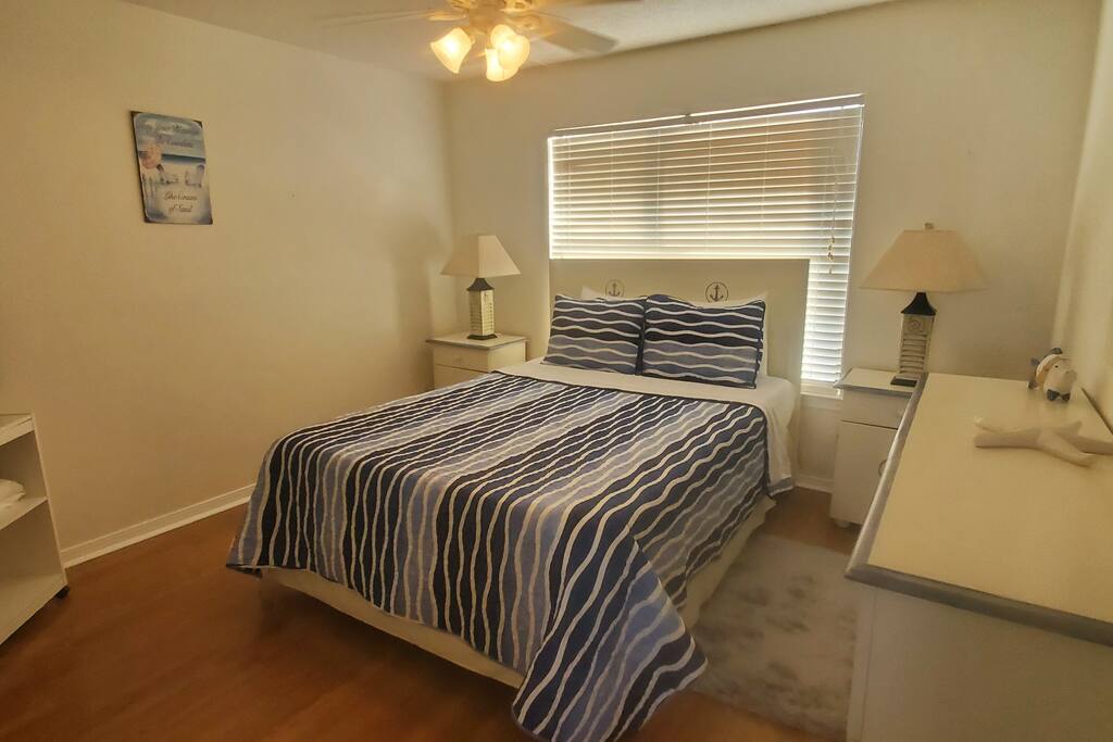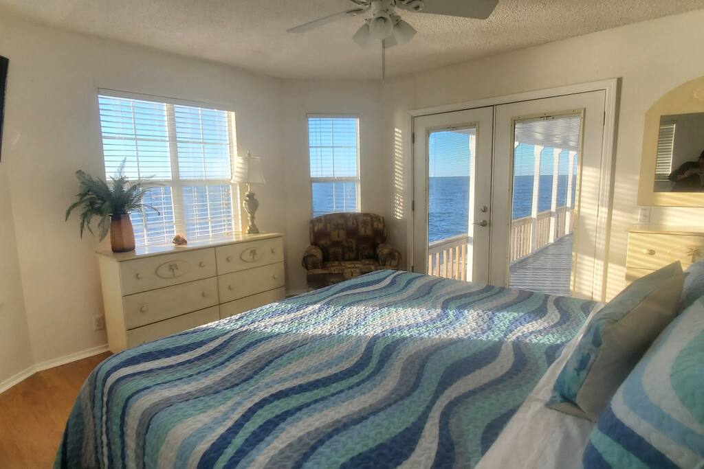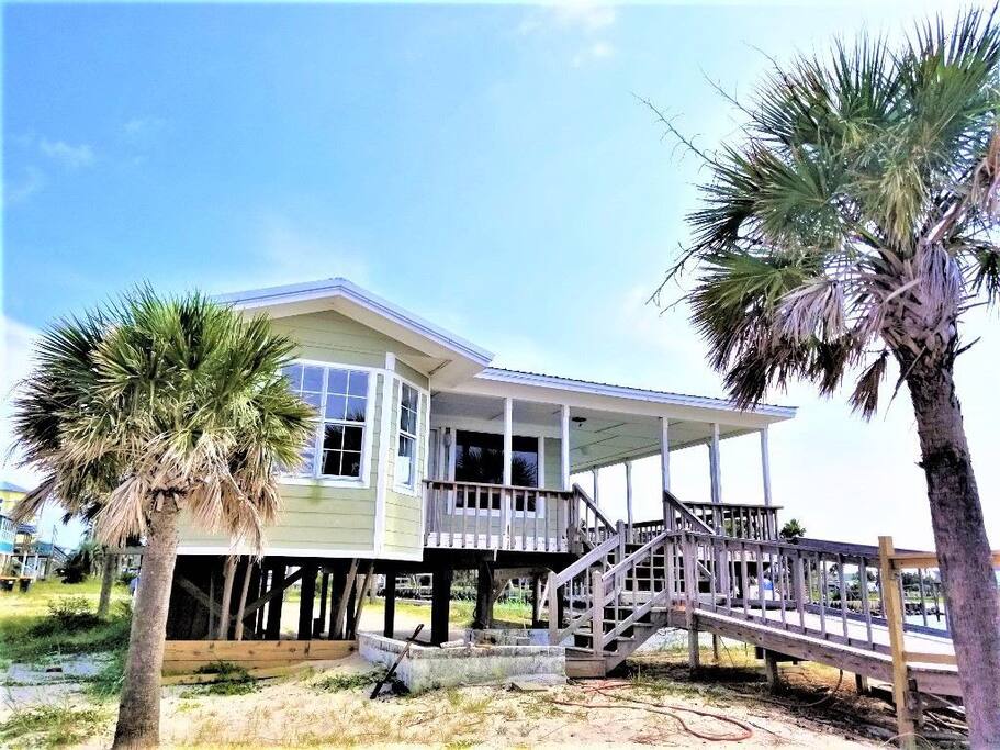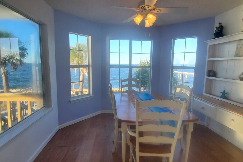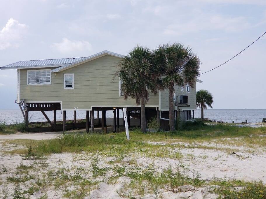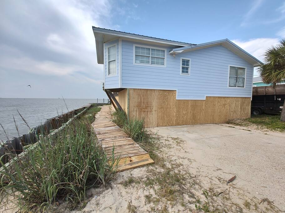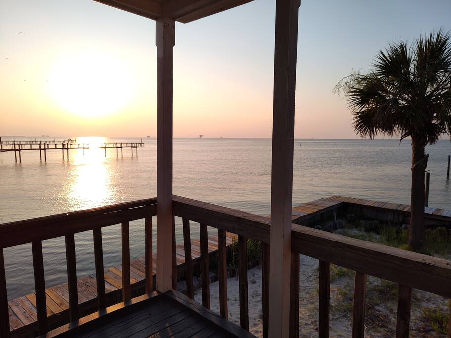 Please note - This unique home has been discounted because part of this seawall still has some hurricane damage but now has about 50 feet of boardwalk along the top of the seawall .Until the seawall is repaired there may be water directly under the house after a storm so currently there's no parking under the house but the rest of this half acre lot will remain dry so there is still plenty of flat parking spaces to accommodate several vehicles. workers may or may not be there during your stay but just working on the wall and not on the house during June & the first part of July. This lake Cottage is unique in many ways! - You could fish right from the porch but also has a boardwalk about 50 ft ) along the top of the seawall. - Beach access across the street! (about 1/4 mile) walk or park right beside the sand! - famous golf courses start about one mile away! - Grocery/Dollar General, gas stations, ferry boat (to Mobile), Tacky Jack's on the water, boat rentals, fishing charters, and a full Spa all very close by! - Fastest WiFi in the area! - Part of the awesome Ft. Morgan community in Gulf Shores that even has pot luck dinners sometimes on the weekends within a couple miles and on the Bay! - It is the last home in the back of the subdivision on a corner lot! - It has one of the best views of Mobile Bay and sunsets and you can also see the sunrise! - It has 150+ feet of private water access to fish, dock your boat, etc.! - Launch your kayak or boat etc. right from this home! - Enjoy the wrap around porch for many different wide views of dolphins swimming, etc. etc.! - Large windows throughout Living room for the best views inside also! - Breakfast nook with a Bay window to enjoy close up views while drinking your coffee or eating dinner with your family and friends! - Lots of windows in the Master bedroom also makes you feel like your outside! - Private bath in Master bedroom plus comfortable mattresses! - Natural wood ceilings for a more cozy cabin feeling! - So you've got golf, beach, open gulf, shopping, restaurants, bars, ice, deli, and the ferry, etc. all close by for your convenience!